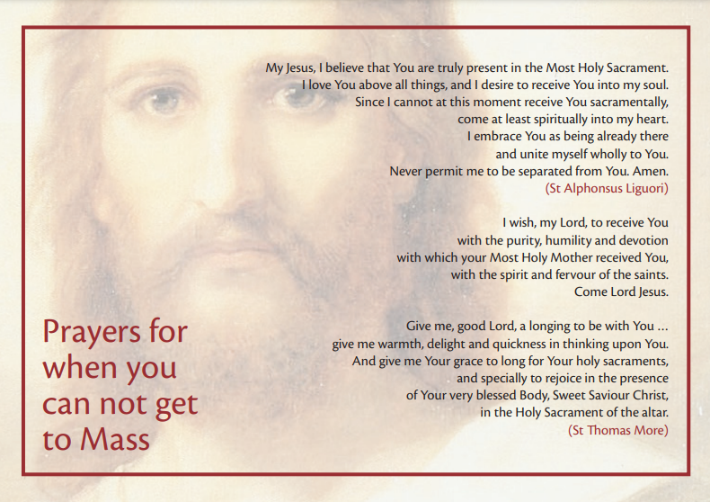 Resources have been prepared for joining in the sacrifice of the Mass from home. The prayer card below is downloadable for use at home. If you wish to use this prayer card, click it, and it will take you to a page to download it.